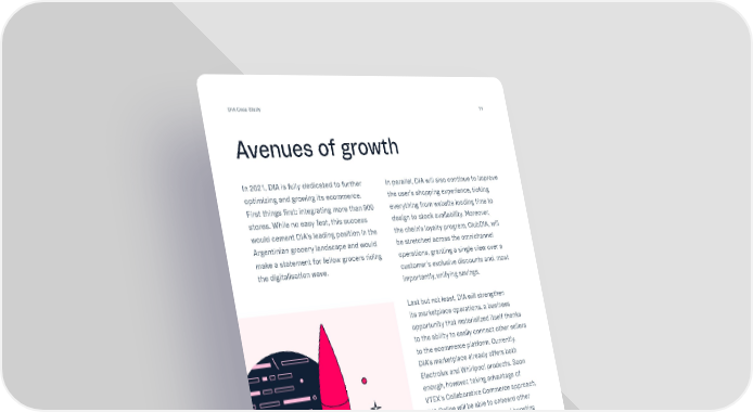 DIA Case Study 11 Avenues of growth In 2021, DIA is fully dedicated to further optimizing and growing its ecommerce. First things first: integrating more than 900 stores. While no easy feat, this success would cement DIA’s leading position in the Argentinian grocery landscape and would make a statement for fellow grocers riding the digitalisation wave. In parallel, DIA will also continue to improve the user’s shopping experience, ticking everything from website loading time to design to stock availability. Moreover, the chain’s loyalty program, ClubDIA, will be stretched across the omnichannel operations, granting a single view over a customer’s exclusive discounts and, most importantly, unifying savings. Last but not least, DIA will strengthen its marketplace operations, a business opportunity that materialized itself thanks to the ability to easily connect other sellers to the ecommerce platform. Currently, DIA’s marketplace already offers both Electrolux and Whirlpool products. Soon enough, however, taking advantage of VTEX’s Collaborative Commerce approach, DIA Online will be able to onboard other retailers, diversifying stock and boosting this supplementary revenue stream. To support these initiatives long-term and to continue the commendable work started in 2020, DIA is training more than 90 people in the commercial area with the aim of shaping omnichannel specialists – a role that all retailers will need in their talent arsenal in this new digital era of commerce. Commerce Architecture