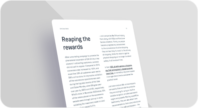 DIA Case Study 10 Reaping the rewards After a marketing campaign to promote the phenomenal expansion of DIA Online, a key element in attracting customers, success did not wait to appear. Compared to 2019, conversion rate increased by 100%, and more than 50% of customers were new to DIA’s online store. An impressive validation of the ecommerce operations was seen during the big retail events of Hot Sale and Cyber Monday, when DIA grew year- over-year by 583% and 316%, respectively. What’s more, in November 2020 alone, 50% of the orders placed on the ecommerce website were through pick-up in-store, validating the investment made in a tool that natively supports this. It is imperative to highlight that these figures are bound to skyrocket in the years to come due to several factors. Firstly, the internet user penetration rate in Argentina is following an upward trend. Secondly, and relatedly, ecommerce maturity is also increasing, as people are gaining both access and trust to online shopping “The challenge was showing our customers the assortment and stock of each of these new stores – but the integration with VTEX made it possible.” – and companies like DIA are helping them along, with FAQs and Customer Service chatbots. Thirdly, as people become progressively accustomed to the convenience of online shopping, they are less likely to revert to the old way of shopping. While the rhetoric against physical shopping will no longer be about safety, it will be about time. In fact, 63% of online grocery shoppers say that online grocery shopping saved them time, an incredibly important aspect in an age where time is considered the greatest asset. Just take a look at DIA: online shoppers can quickly find and add the products they are looking for using an intuitive website navigation, an advanced search engine and powerful filtering capabilities. Additionally, they can also obtain item recommendations. And once products are in the cart, they will not disappear – the registered shopper will not need to waste any more time repeating the process if something urgent had to be done that very second or if the laptop’s battery suddenly died. And, of course, the flexibility of having home delivery or pick-up in-store – in up to three hours for over 100 stores – is the cherry on top. Digitalisation has the potential to deliver unprecedented convenience and personalization, which means that the changes in consumer behaviour that we are witnessing today are not fleeting – they’re profound and enduring.