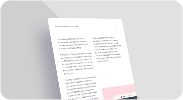 How Motorola Scaled its Global D2C Operations 6 A successful global business requires understanding the specificities of local laws and regulations and to demonstrate a certain level of adaptability. Differences in international regulations can vary greatly: as a manufacturer, Motorola is unable to sell directly to consumers in the European Union whereas this is not an issue in the United States, hence why they only had an online catalog without e-commerce in the region. Driven by the desire to open new channels, promote efficiency and reduce their operational costs, the European operation underwent a huge digital transformation with VTEX playing a consultative role. To overcome the limitations of European regulations, VTEX recommended that Motorola employ a full commerce partner to sell and fulfill orders on their behalf. They changed their main European warehouse from Amsterdam to Poland. Despite Motorola’s initial plan to merge their operations with Lenovo’s distribution center in Ukraine, they realized that outsourcing to a third party can bring better results, as demonstrated by the 30% decrease in delivery times for their European markets.
