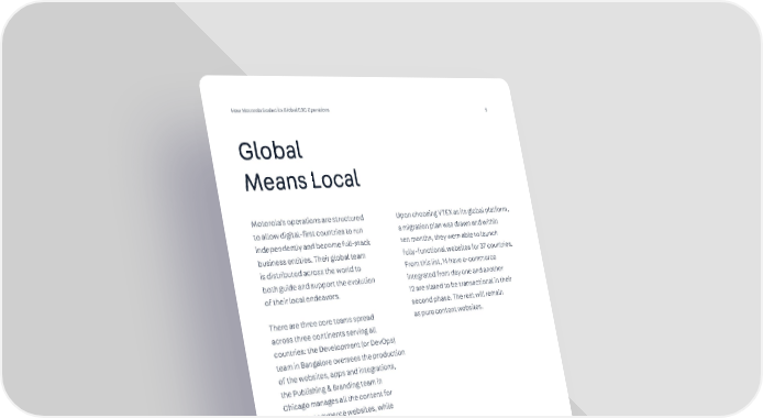 How Motorola Scaled its Global D2C Operations 5 Global Means Local There are three core teams spread across three continents serving all countries: the Development (or DevOps) team in Bangalore oversees the production of the websites, apps and integrations, the Publishing & Branding team in Chicago manages all the content for the non-commerce websites, while the Marketing team in Europe is responsible for all marketing initiatives. Motorola’s operations are structured to allow digital-first countries to run independently and become full-stack business entities. Their global team is distributed across the world to both guide and support the evolution of their local endeavors. Upon choosing VTEX as its global platform, a migration plan was drawn and within ten months, they were able to launch fully-functional websites for 37 countries. From this list, 14 have e-commerce integrated from day one and another 12 are slated to be transactional in their second phase. The rest will remain as pure content websites.